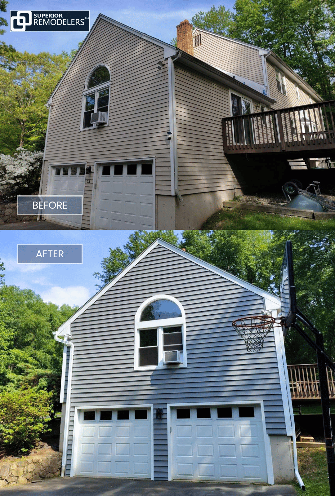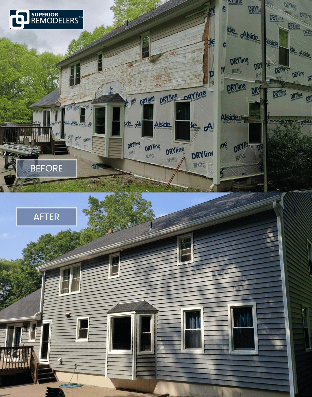 Superior Remodelers replaced the old roof with high-quality, weather-resistant shingles for improved protection. We installed modern vinyl siding in a rich gray tone with crisp white trim, replaced both entry doors for better energy efficiency, and added new gutters to ensure proper water flow and foundation protection.