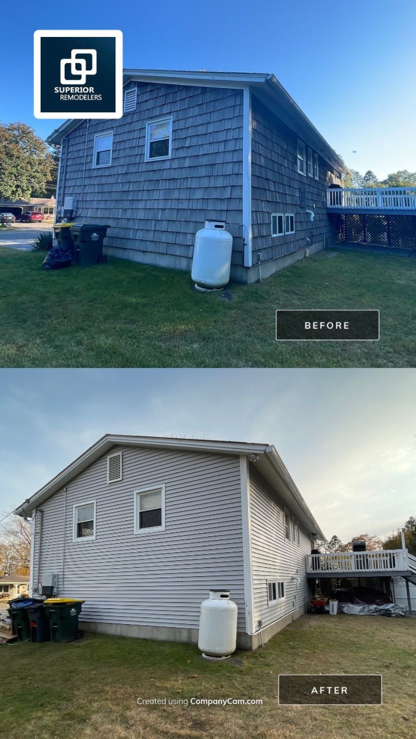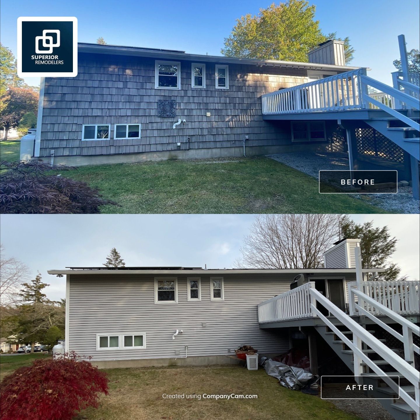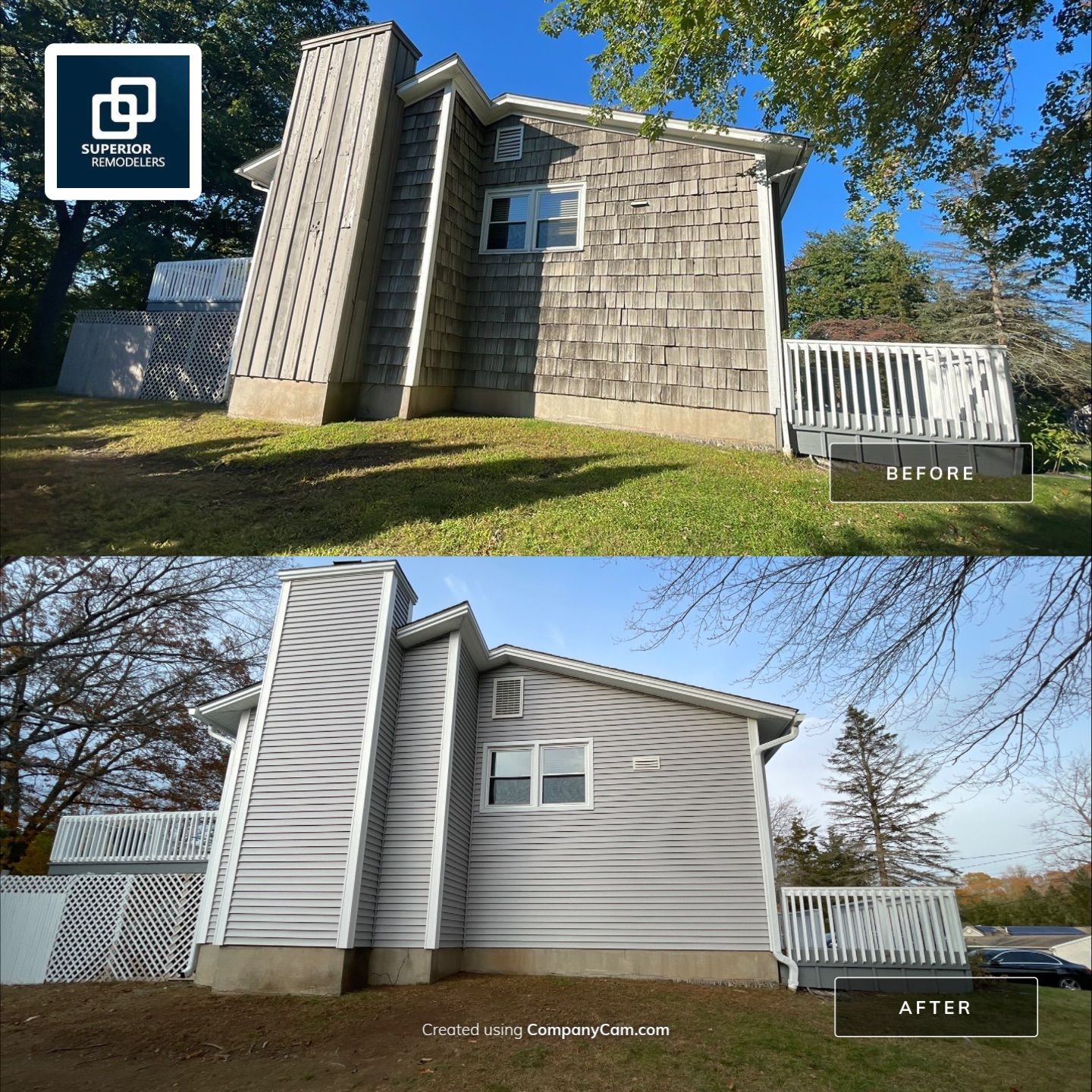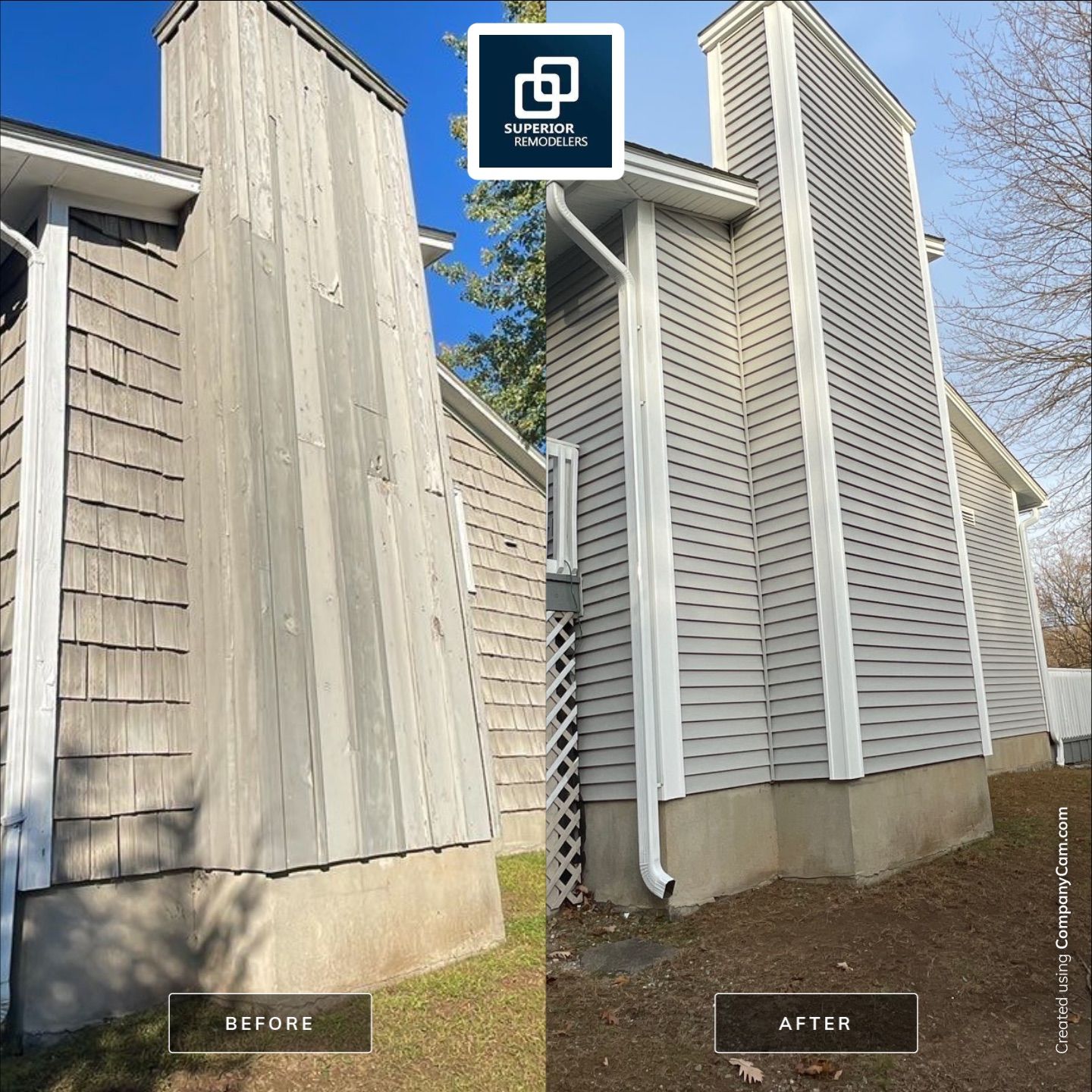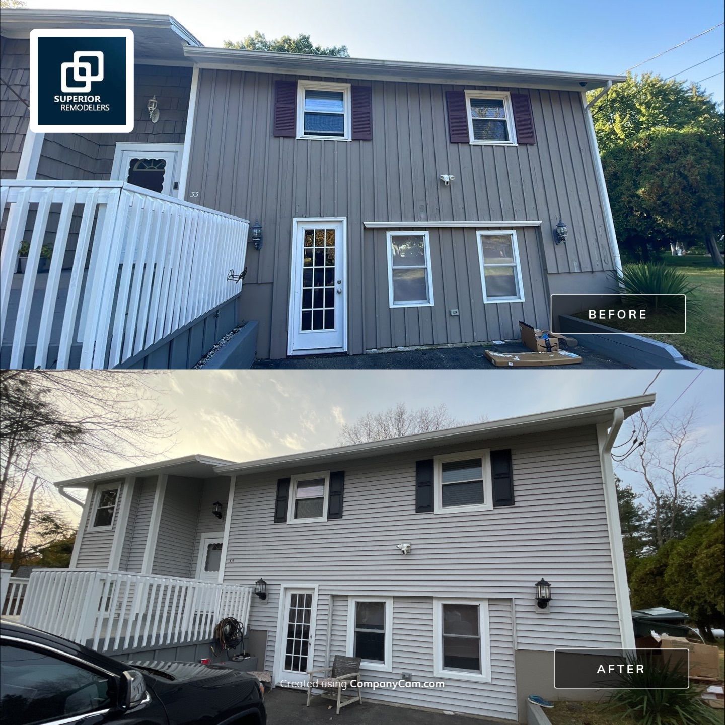 Superior Remodelers replaced the aged siding with durable, energy-efficient vinyl siding in a clean light gray tone accented by white trim and dark shutters. In addition, we installed brand-new seamless gutters to improve water flow and protect the home’s foundation from future damage.
