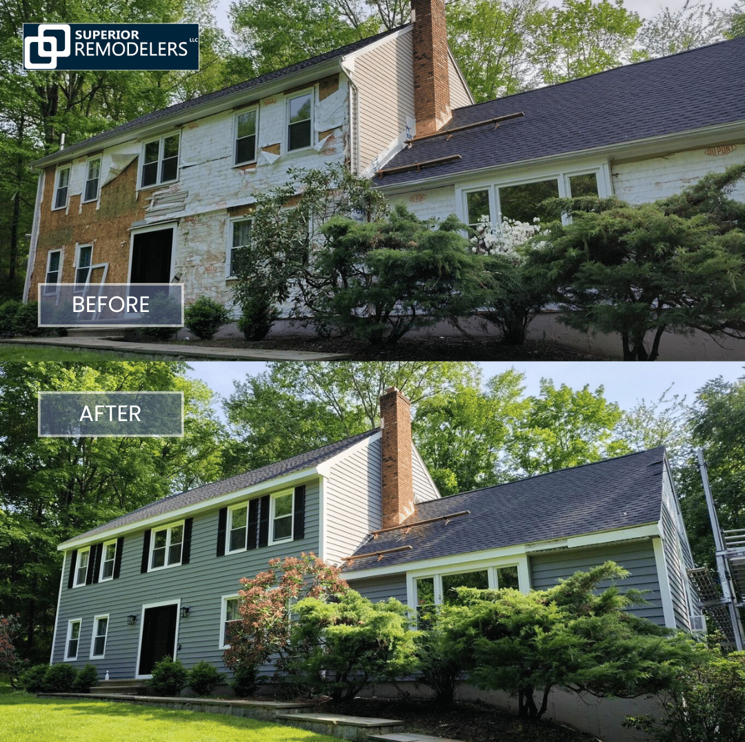 Superior Remodelers replaced the old roof with high-quality, weather-resistant shingles for improved protection. We installed modern vinyl siding in a rich gray tone with crisp white trim, replaced both entry doors for better energy efficiency, and added new gutters to ensure proper water flow and foundation protection.