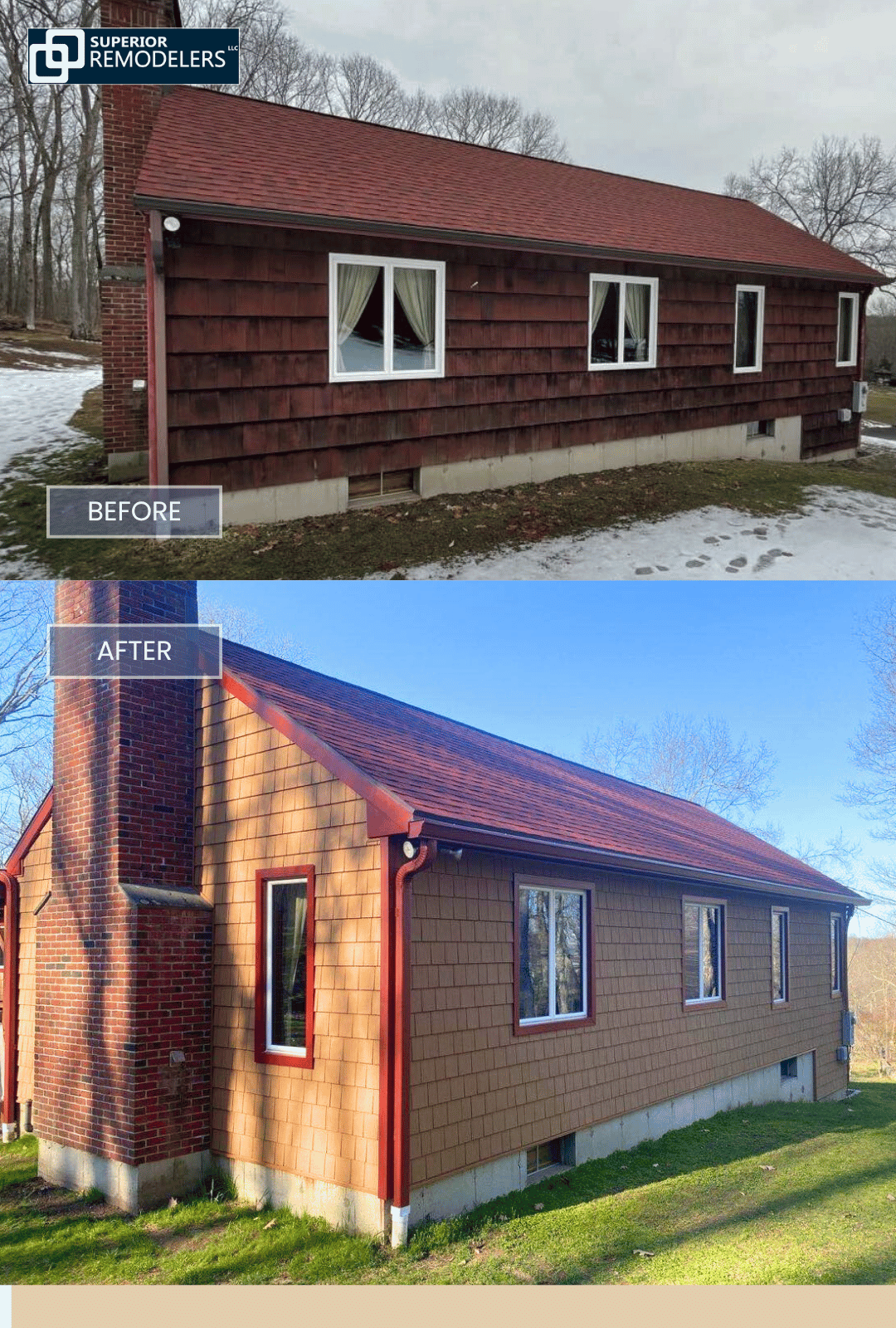 Superior Remodelers installed new cedar-style vinyl siding in a warm tan tone, complemented by crisp white trim for a clean contrast. All windows were replaced with energy-efficient units, and new gutters were added for proper drainage. Updated storm and entry doors completed the transformation — giving the home a fresh, cohesive look and long-lasting durability.